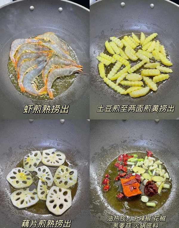 3:起鍋燒油,先將土豆和藕片煎熟撈出備用,大蝦煎至兩面金黃備用