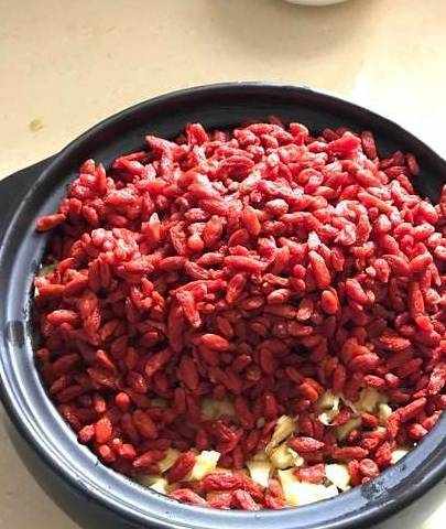 2.把生薑、紅棗、桂圓、枸杞、紅糖層層鋪好,放入鍋內,小火慢熬。
