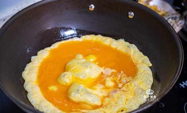 2、開火熱鍋,加入適量的食用油燒熱,倒入雞蛋液,使熱油充分地滋潤蛋液,蛋液慢慢凝固,散發焦香後繼續翻面同樣煎至定型。