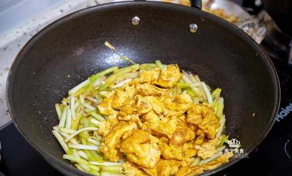 3、已經凝固定型的蛋液利用炒勺拆成小雞蛋塊,再快速地倒入韭黃一起翻炒,雞蛋和韭黃都是易熟品,不要炒過長時間瞭。