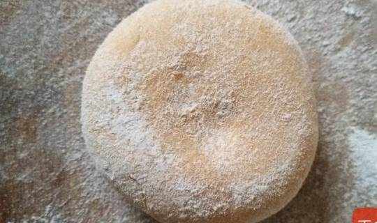 7.取一個面劑子按扁,像包包子一樣將少許豆沙餡放中間,然後捏緊收口朝下,這時候預熱電餅鐺,