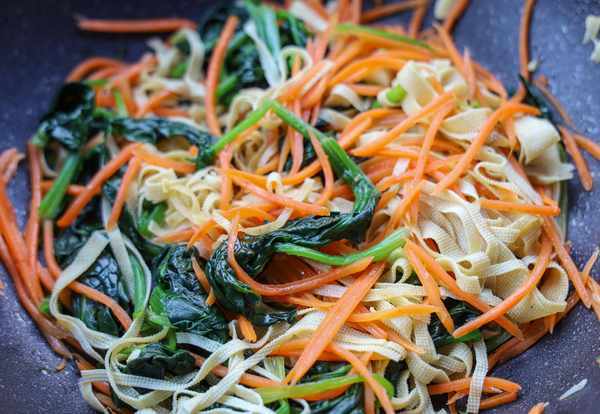 5.倒入千張絲菠菜,加蠔油和雞精和少許白糖調味,炒勻即可