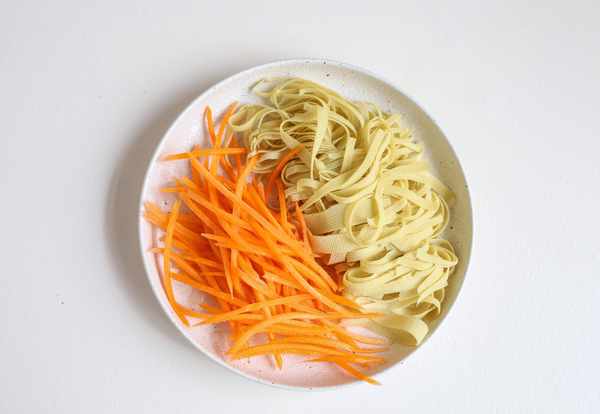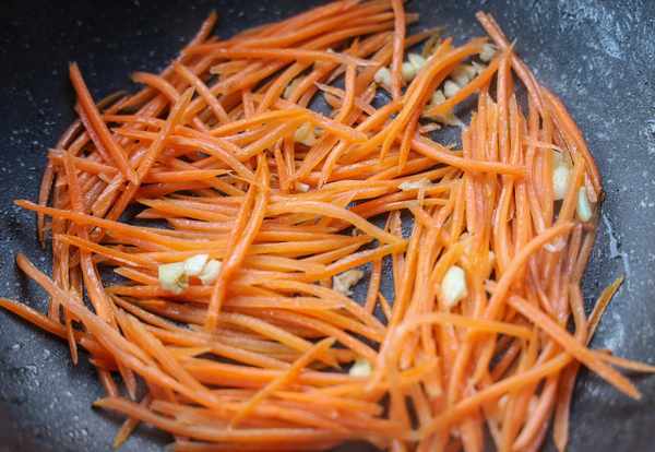 4.鍋裡放油燒熱放蒜末,炒出香味,加入胡蘿卜絲,炒至變軟