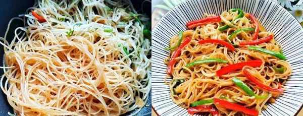 ④然後倒入粉絲,翻炒均勻,加點生抽、淀粉水調味,炒半分鐘關火起鍋。