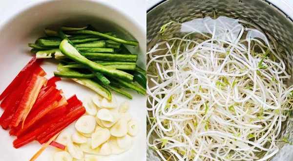 ①豆芽富含蛋白和水分,能加快新陳代謝,幫助排毒,代謝脂肪。除瞭豆芽,再準備青紅辣椒各一個,切絲備用。
