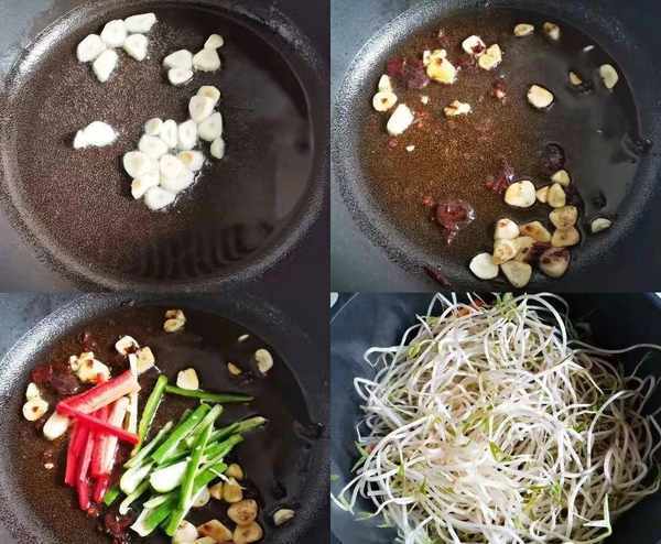 ③接著熱鍋,放油,蒜末炒香,倒入青紅辣椒絲翻炒,再倒入豆芽,放點食鹽炒扁。