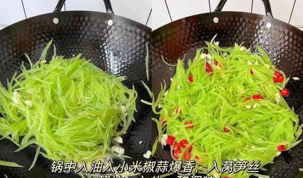 ②接著熱鍋放油,小米椒、蒜末炒香,倒入萵筍絲,再放點食鹽、醋調味,炒1分鐘起鍋。