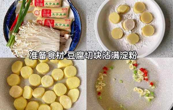 ①金針菇含有大量纖維素,能清掉腸道內的油脂。準備好金針菇。豆腐,切好備用。豆腐裹上面粉,然後下鍋煎到雙面金黃色撈起來。再熱鍋爆蒜香。