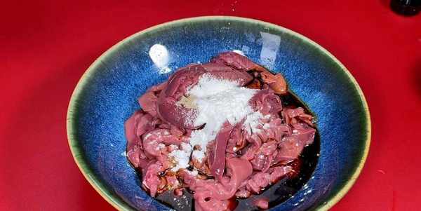 3.腰花中加入適量的鹽、胡椒粉、生抽、老抽、料酒、幹淀粉,再用抓拌均勻,醃制15分鐘。