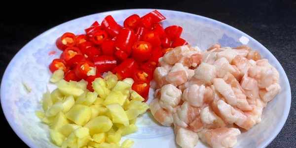 4.小米椒切成圈、野山椒切成小段、大蒜切成小粒、生薑去皮切成小粒、韭菜洗凈切成小段,全部切好後裝入碗中備用。
