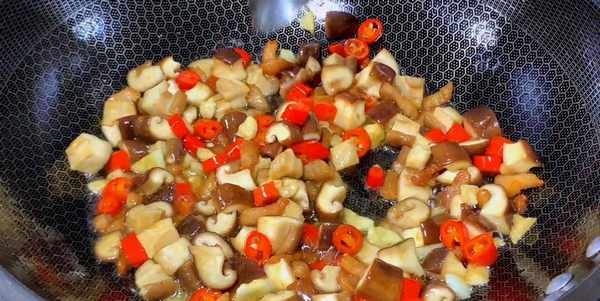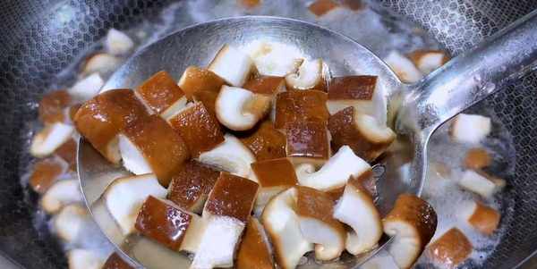 5.鍋內再倒入香菇丁,焯燙一下,可以有效的去除裡面的草酸,焯水2分鐘左右,將香菇焯燙至變軟炒出備用。