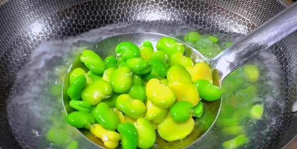 4.鍋內倒入適量的清水,水開後加入少許食鹽、幾滴食用油,倒入蠶豆,用鏟子輕輕推動,使其受熱均勻,焯水1分鐘左右,撈出控幹水分備用。