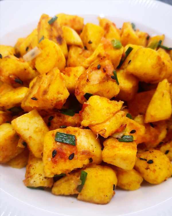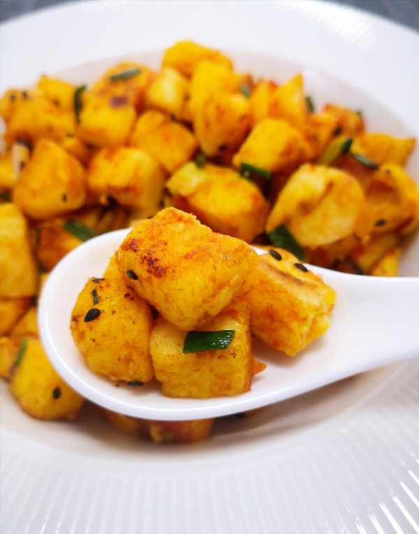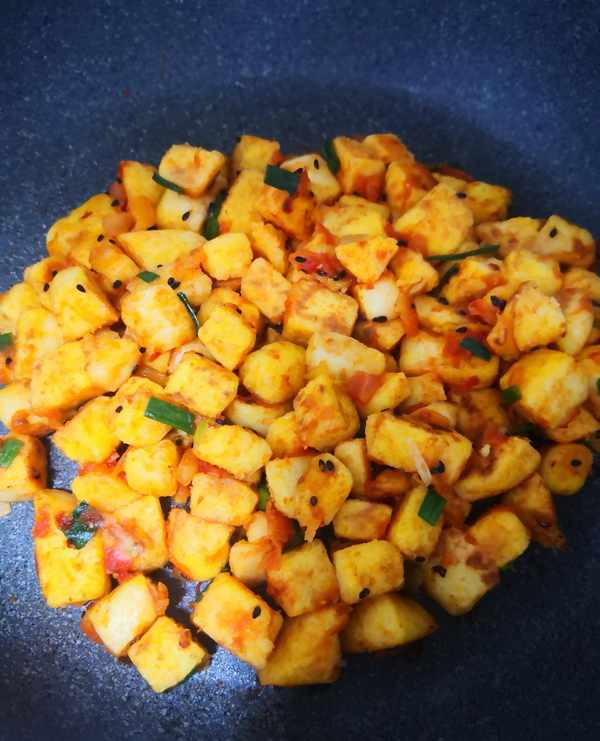 翻炒均勻,翻炒至表面變幹加入蔥、熟黑芝麻點綴,根據個人口味還可以加點五香粉、黑胡椒粉、辣椒粉、孜然粉等。