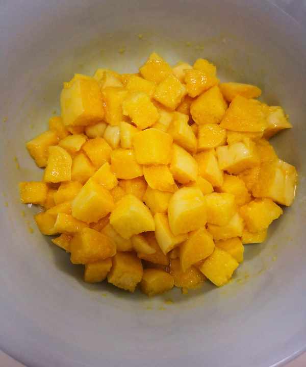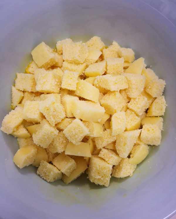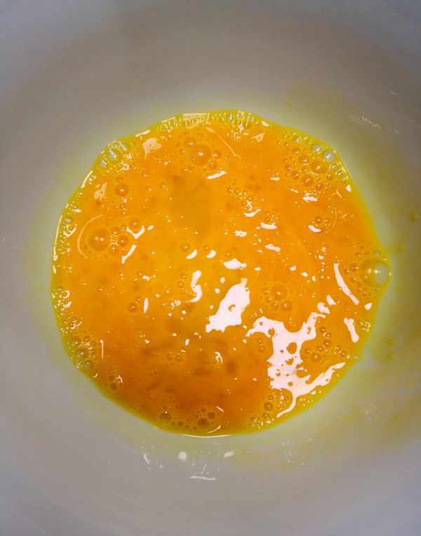 用筷子拌均勻,使每一個饅頭丁都裹上薄薄一層雞蛋液。