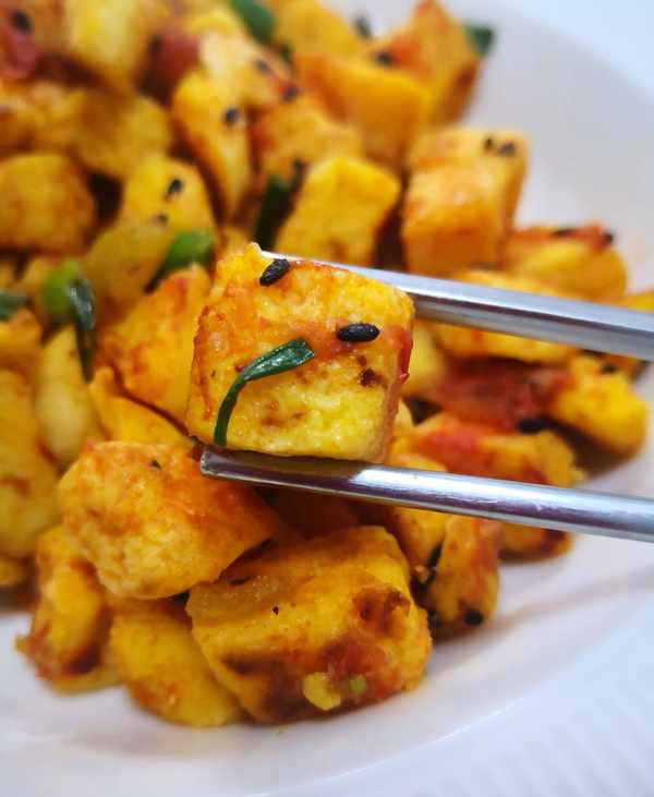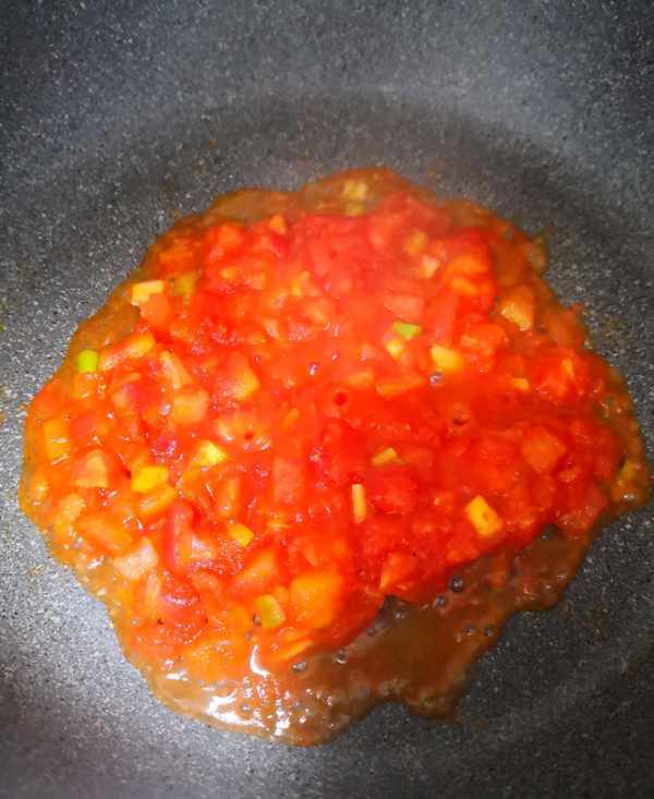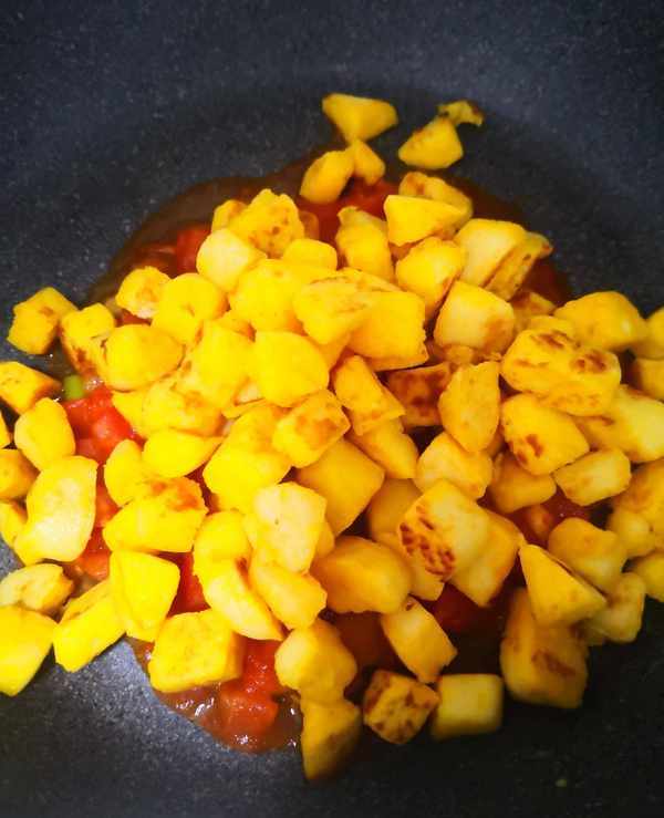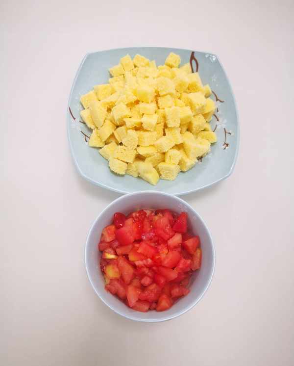 4.番茄不要多,主要是增加酸香的風味,如果番茄量大,炒出的湯汁太多,導致很難炒至饅頭變幹,影響外焦的口感。