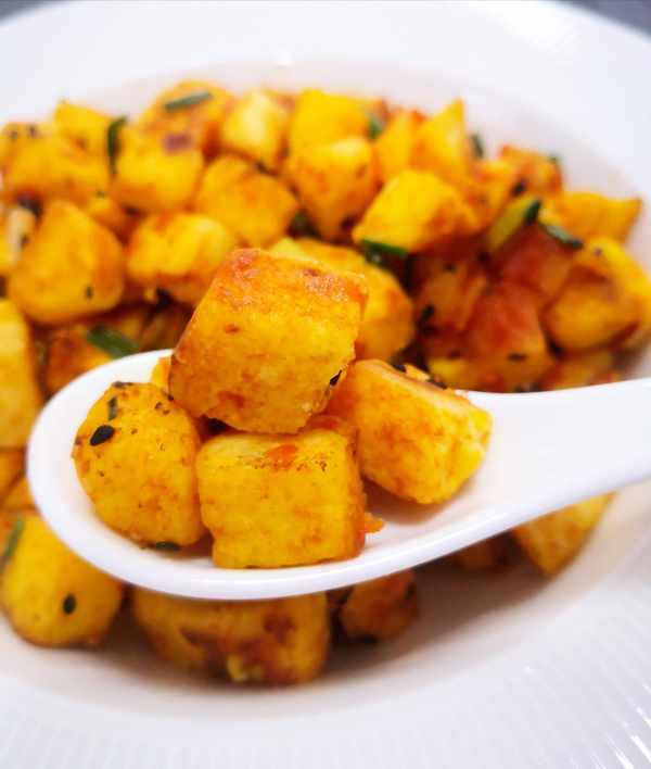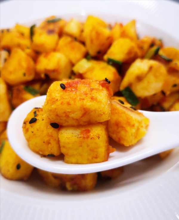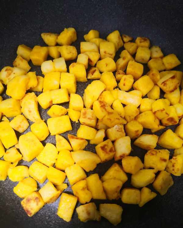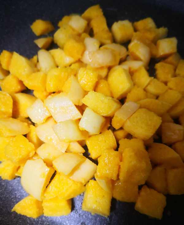 2.用我這個比例做出來的炒饅頭成品色澤更金黃,如果用白面饅頭做色會淺些,註意不要用剛出鍋的饅頭,剛出鍋的饅頭很軟不好切成小丁。