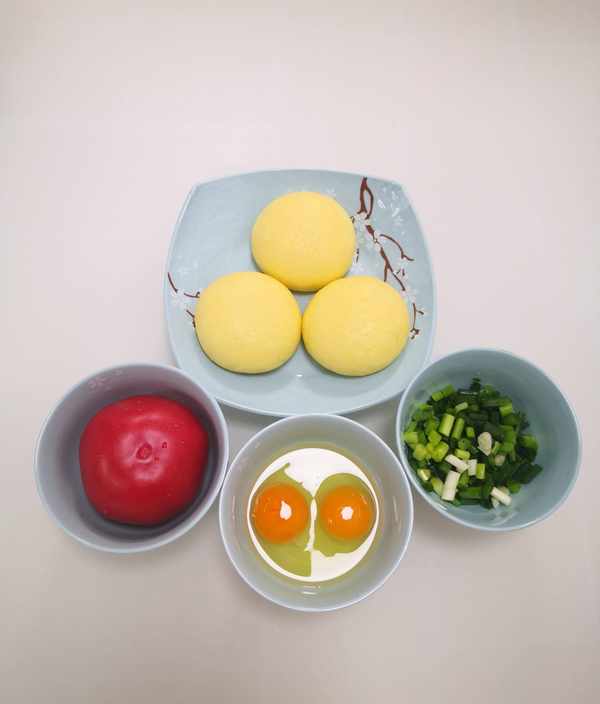 準備一個番茄、兩個雞蛋、適量蔥花,我的每一個饅頭生胚重約50克,3個饅頭用兩個雞蛋剛剛好。