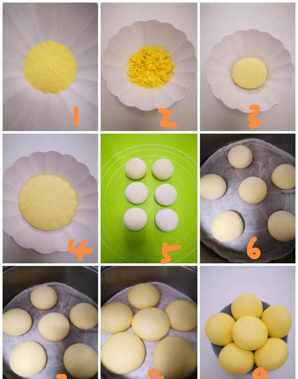 1~2.玉米面先用開水燙成小疙瘩,晾至溫熱後加適量酵母拌均勻;