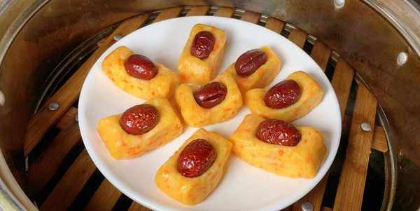 4、最後把做好的胡蘿卜糯米糕擺放在一個幹凈無油的蒸碟內,冷水開始蒸,大火把鍋內的水煮開後繼續蒸10分鐘。最後蒸熟後直接掀起鍋蓋拿出來食用即可。