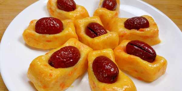 【胡蘿卜糯米糕】 所準備的食材有:胡蘿卜一根、100克糯米面、50克幹面粉、少許白糖、紅棗