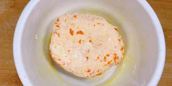 2、胡蘿卜蒸熟以後,用小勺趁熱把它搗碎,胡蘿卜碎要放涼後再放入100克的糯米面、50克幹面粉、少許白糖,太熱放進去把面粉燙熟,用筷子把它攪拌一下,可以適量的加入冷水,最後把它揉成一個面團。糯米面在和面的過程中容易粘手,盡量戴上一次手套。