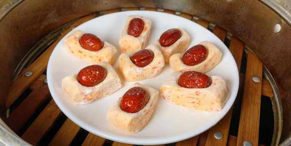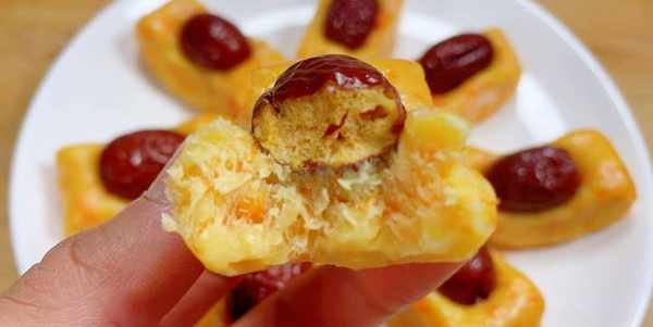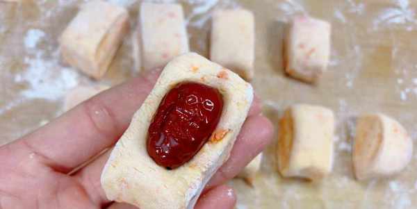 3、準備幾個大棗用清水洗幹凈備用,直接把面團取出來,放在案板上揉成長形的方塊狀,切成小塊,最後把洗幹凈的紅棗摁壓在面胚上面就可以。