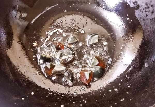 2.鍋中入油,油熱後把切好的皮蛋丁入鍋用小火煎香後盛出。
