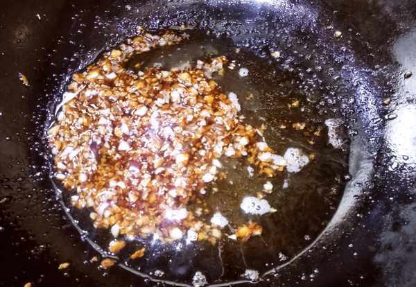 3.大蒜剁成蒜蓉用清水投洗去粘液,撈出瀝幹水分後,一半入油鍋中用小火炒出香味,烹入料酒和一品鮮醬油,加入鹽、蠔油和白糖炒勻後,把另一半蒜蓉入鍋關火拌勻成蒜蓉醬。