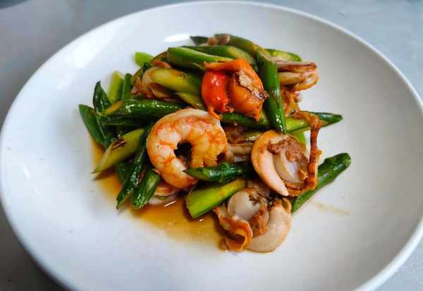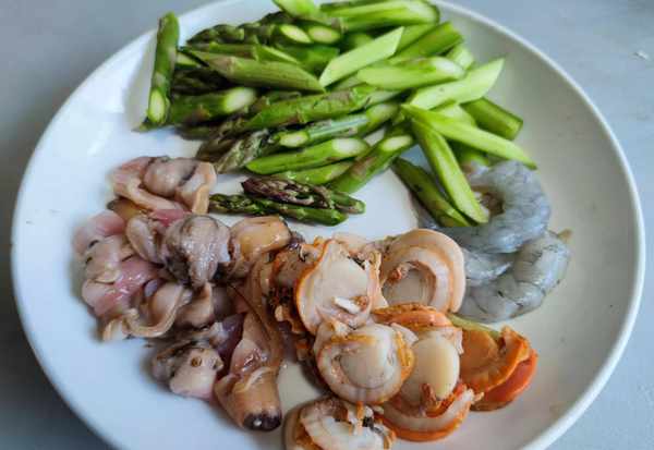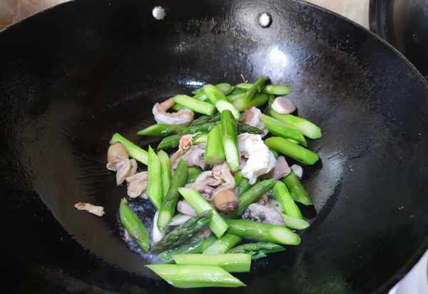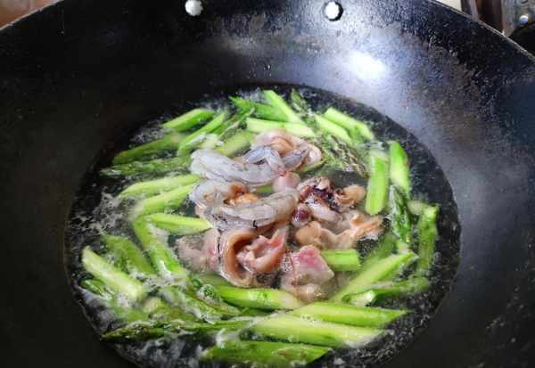 5.鍋中入油爆香蔥薑蒜,下入蘆筍和焯燙好的蝦仁和大蛤肉,烹入料酒後翻炒均勻,加入鹽、胡椒粉和蠔油調味,下入貝肉翻炒均勻,滴幾滴藤椒油即可出鍋享用。