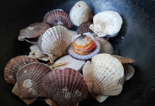 2.洗凈的日月貝入鍋,加入料酒和薑片,煮至開口後撈出,去除貝殼後取肉,把黑色的內臟去除。