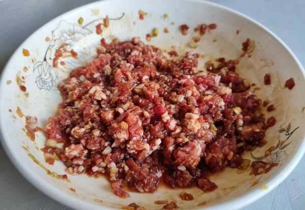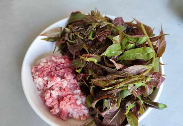 1.豬梅花肉洗凈後斬剁成餡,香椿摘洗幹凈後把掐不動的老根去除。