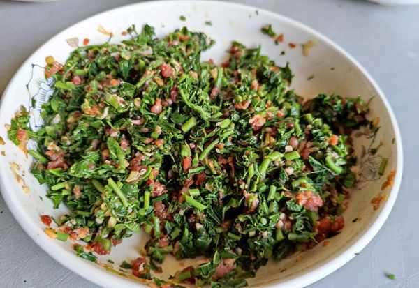 2.鍋中燒水,水中加入少許鹽和幾滴食用油,把香椿入鍋焯燙至顏色翠綠撈出過涼,過涼後的香椿攥幹水分切成細末。
