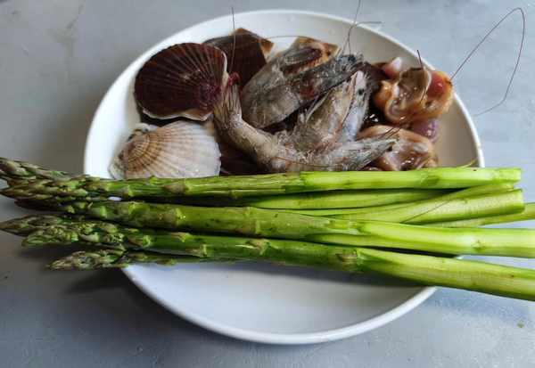 4.鍋中燒水,水中加入少許鹽和幾滴食用油,水開後下入蘆筍焯燙至顏色翠綠,把蝦仁和大蛤肉也入鍋焯燙至蜷縮後撈出過涼。