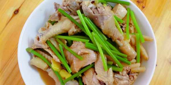 第4道:【蒜苔炒雞塊】雞塊焯水撈起,蒜苔焯過水後過冷水,熱鍋熱油爆香薑與蒜,倒入雞塊煸炒,加入鹽、生抽、蠔油少許米酒炒勻,米酒會令炒雞肉更鮮嫩,然後再加入沒過雞塊的開水,中小火燜煮20分鐘,加入蒜苔再煮5分鐘,香噴噴的蒜苔炒雞塊就可以下飯瞭。