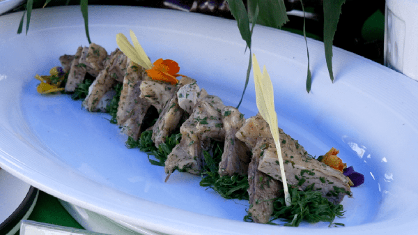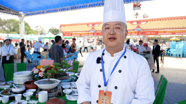 文山詩達酒店廚師 楊明才:“我們每一道菜都是采取葷素搭配、顏色鮮明,比如臘三線,單獨吃會比較膩,我們就采取葷素搭配,涼鴨我們就采取麻栗坡的民族特色飲食習慣,加入檸檬葉,再比如炒脆肚采取日月同輝的裝盤形式,寓意著我們文山的餐飲事業蒸蒸日上,欣欣向榮地發展。”