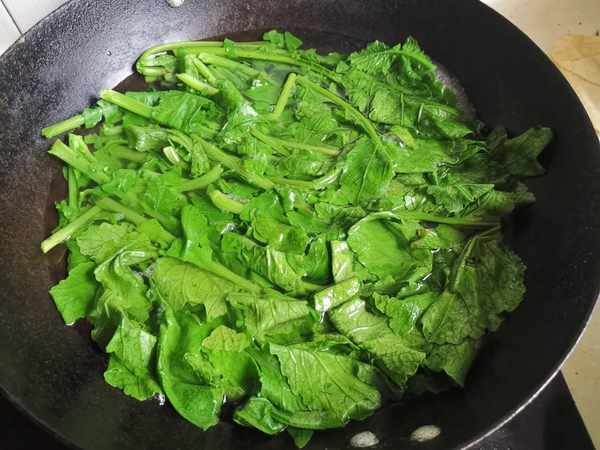 第二步:蘿蔔纓子放入開水中汆燙,然後撈到冷水中,去除蘿蔔纓子的菜腥味。