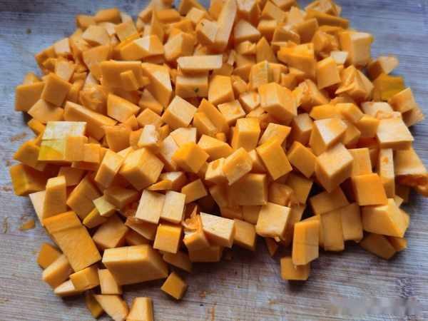 做這款飲品,我們用這種黃皮黃瓤的南瓜味道更香甜,先把南瓜去皮,切成小丁。