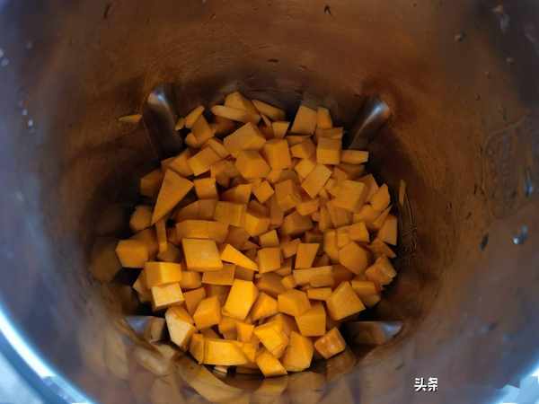 把所有南瓜丁放入豆漿機中。南瓜一定不要切大塊,大塊豆漿機中放不了幾塊,打出的南瓜汁也就不濃稠。