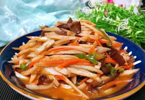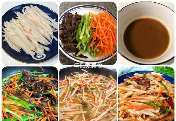 (2)然後將配菜胡蘿卜,青椒,泡過的木耳分別切成細絲兒,再切點蔥花蒜末