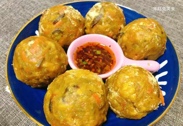 12、菜團子蒸好瞭,關火取出來裝盤,中間放上萬能料汁,搭配起來更美味