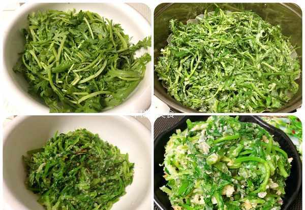 (1)茼蒿去根洗幹凈,將多餘的水分控出來切成長段,放入盆中淋一些食用油拌勻