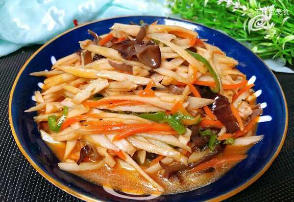 (5)接著倒入蓮藕條炒至斷生,最後倒入魚香料汁不停地翻炒將湯汁收一收,就可以出鍋瞭
