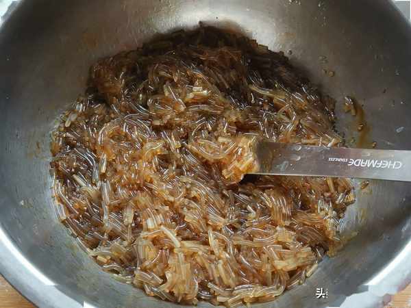 第二步:粉條用開水煮開,浸泡至發軟,撈出控幹水分,加入醬油拌勻上色,再加入花生油拌勻。