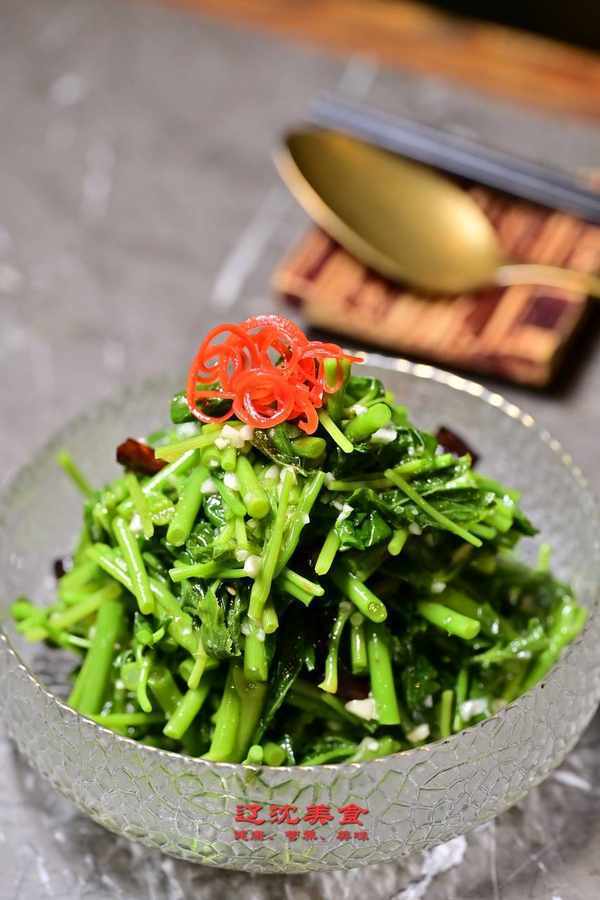 刺五加葉是在春季初發的時候采收的嫩莖葉,入沸水鍋焯後,清水浸泡,加以蒜蓉平衡苦感,為餐廳春季菜品。