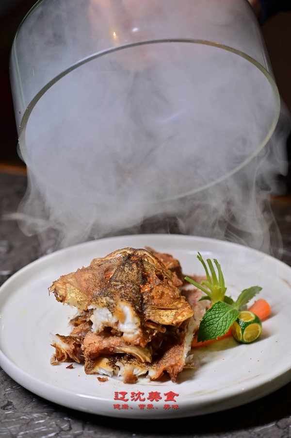 菜品使用北方淡水鱸魚,經簡單醃制後過油煙熏烘烤而成,靈感來於中餐廳行政總廚寧師傅小時候在河裡抓魚,上岸後簡單清理用火熏烤後食用,這道菜回歸最簡單的制作方式搭配櫻花木煙熏可更好的去掉燒火味而增加木香。