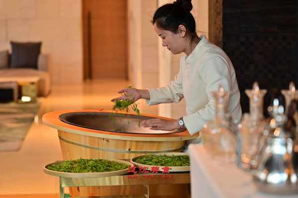 芊麗酒店大堂炒春茶啦,酒店特約杭州炒茶師現場炒茶品茗,喜歡明前綠茶的朋友千萬不要錯過,共同品鑒這份來自西湖龍井的新鮮茶葉。