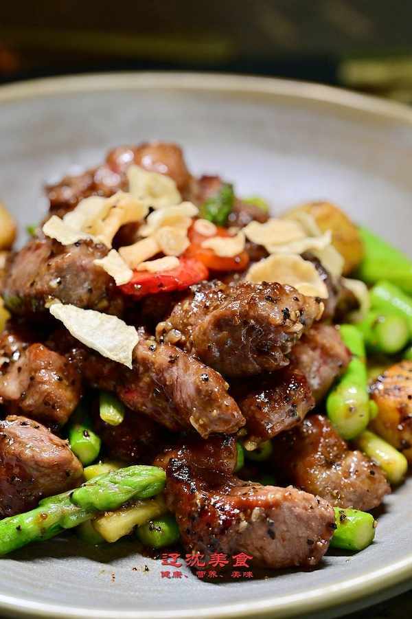 雪花牛肉使用澳洲牛眼肉,口感非常細膩,加上蘋果、蘆筍、蒜片,翻炒烹制入味,菜肴烹調方法和調味都力求簡單、精致。重在還原食材本味、突出其本身的特色和質感。