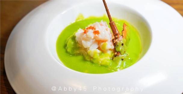 【碧綠黑松露龍蝦】:很西式的做法,下面有土豆泥,沾上青豆汁,上面是龍蝦肉和蟹籽,讓人在吃瞭一系列辣之後,來這麼一道清新雅致的菜,對身體是一個很好的緩沖。而且飽滿的蝦肉與綿糯的土豆泥沾瞭青豆汁,碰撞出的口感很不錯。