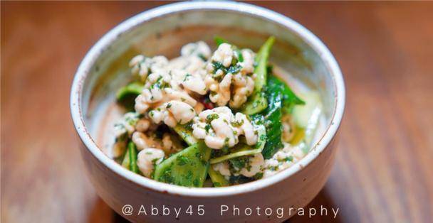 【薄荷醬拌鮮核桃】:是怕辣的朋友會喜歡的菜,薄荷的清涼、黃瓜片的清脆多汁加上核桃的嚼勁,口感層次豐富,清爽不膩。