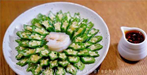【醋汁撈秋葵】:作為上的第一盤菜沒有辜負我對他們傢菜品的期望,造型滿分,層次分明,當澆上微辣醋汁之後更是有瞭靈魂,是越吃越愛的味道,很清新爽口,也很適合漸漸炎熱的天氣。